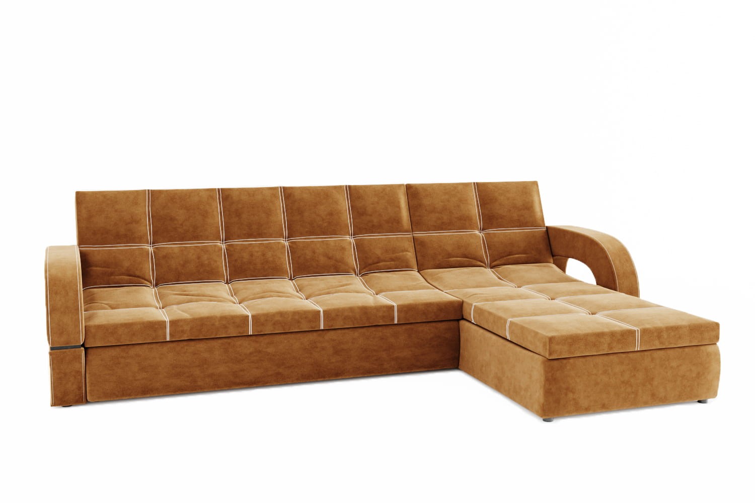 Особенности дивана: Каркас: ЛДСП, фанера, брус. Эргономичная мебель, позволяющая создать стильный интерьер. Обит качественным и плотным текстилем. Опорные элементы каркаса помогают равномерно распределять вес, благодаря чему напольное покрытие не продавливается. Механизм трансформации позволяет быстро и без особых напряжений превратить диван в удобное спальное место. Глубина дивана без учёта оттоманки: 1050 мм.